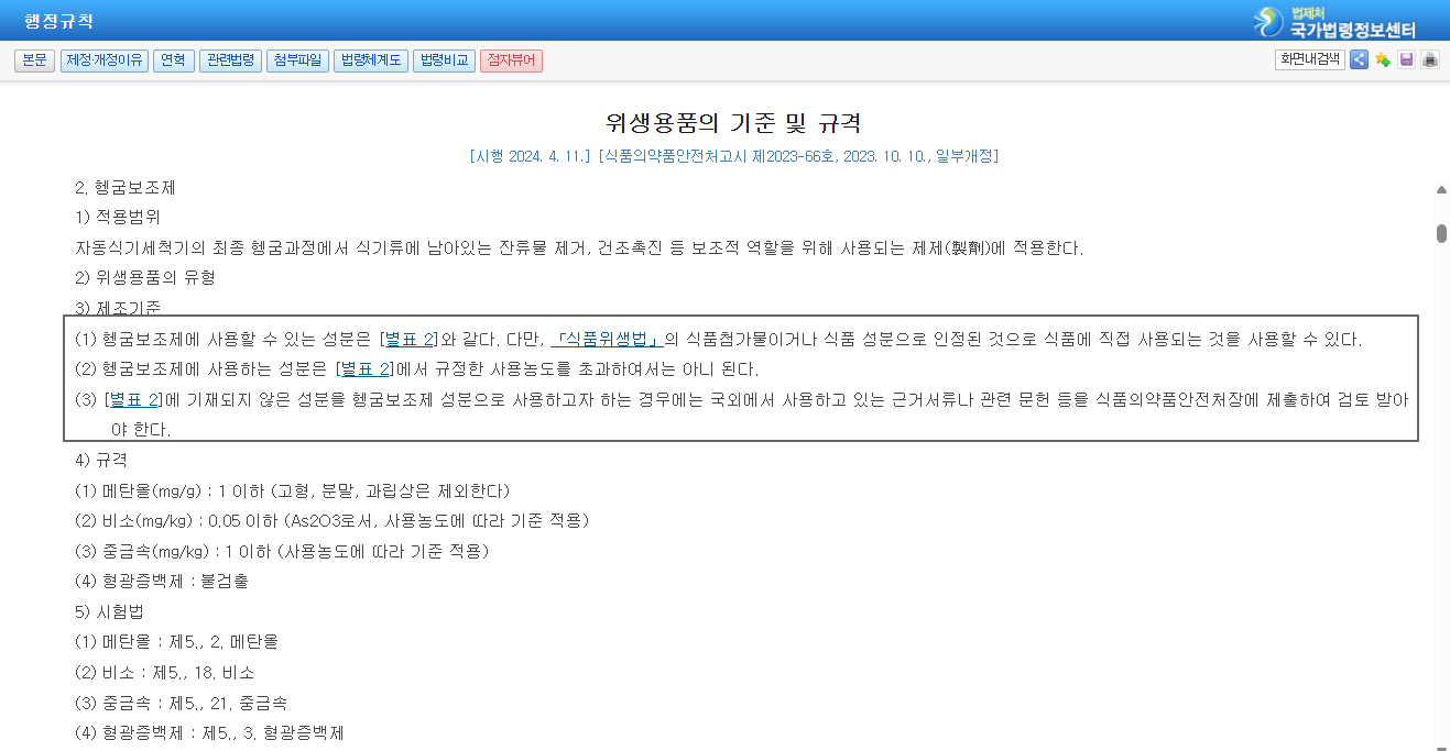 파일:(20250507 main1-2)국가법령정보센터-위생용품의 기준 및 규격-제3. 개별기준 및 규격 2. 헹굼보조제.png